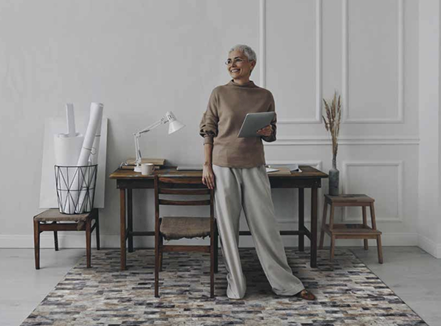Unsere Designs sind in zwei verschiedenen Rapportgrößen erhältlich und in sechs modernen Farbwelten verfügbar. Sie entscheiden, ob Teppichboden oder abgepasster Teppich – passend für jeden Raum und jede Umgebung. Kleiden Sie Ihre Räume mit Texturen, die Geschichte und Innovation miteinander verbinden. Ob in privaten Wohnbereichen, Büros, Hotels oder Ladengeschäften – unsere Designs verleihen Ihren Räumen Charakter und Stil.