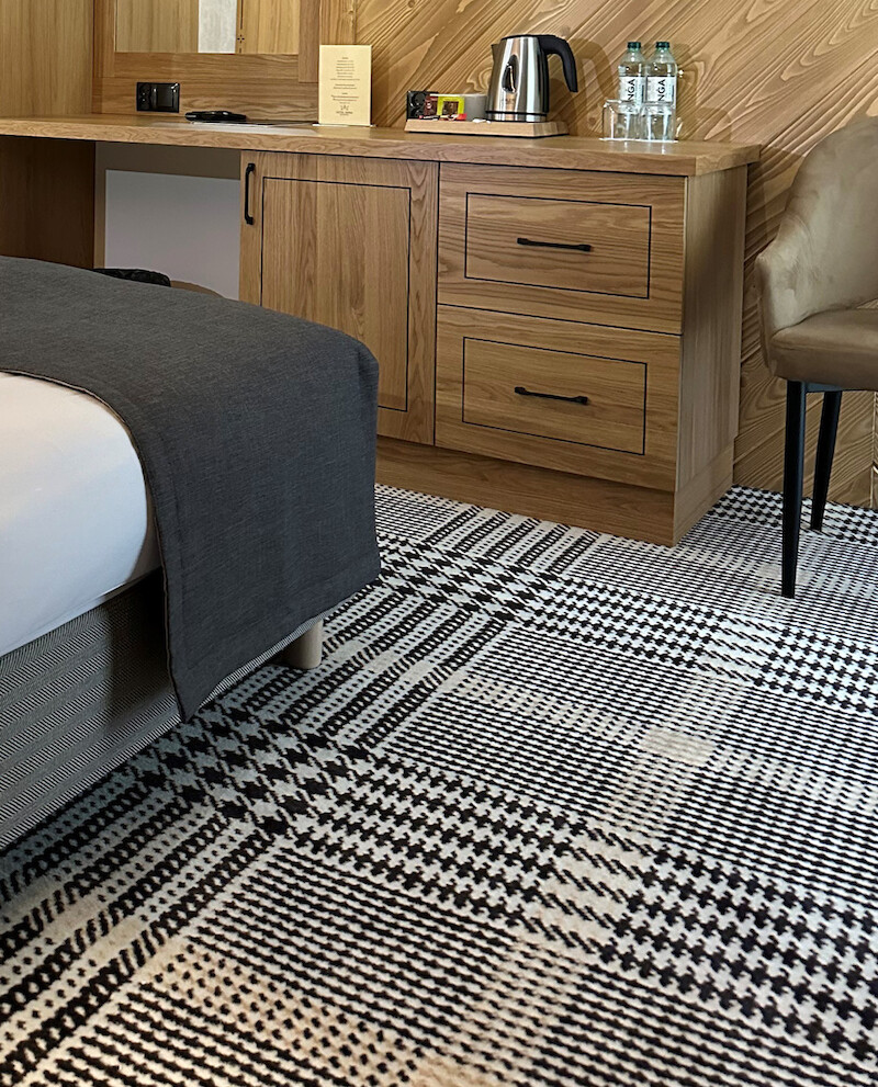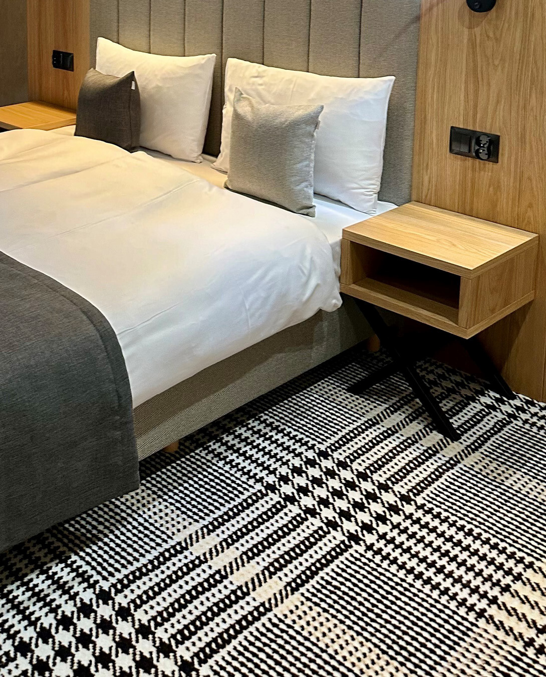 Together with our partner Newmor Polska, we were able to contribute to the design of this special ambience. The guest rooms combine warm wood with a softly textured carpet in a customised grid pattern - a combination that creates a cosy atmosphere and stylishly reflects the character of the region.