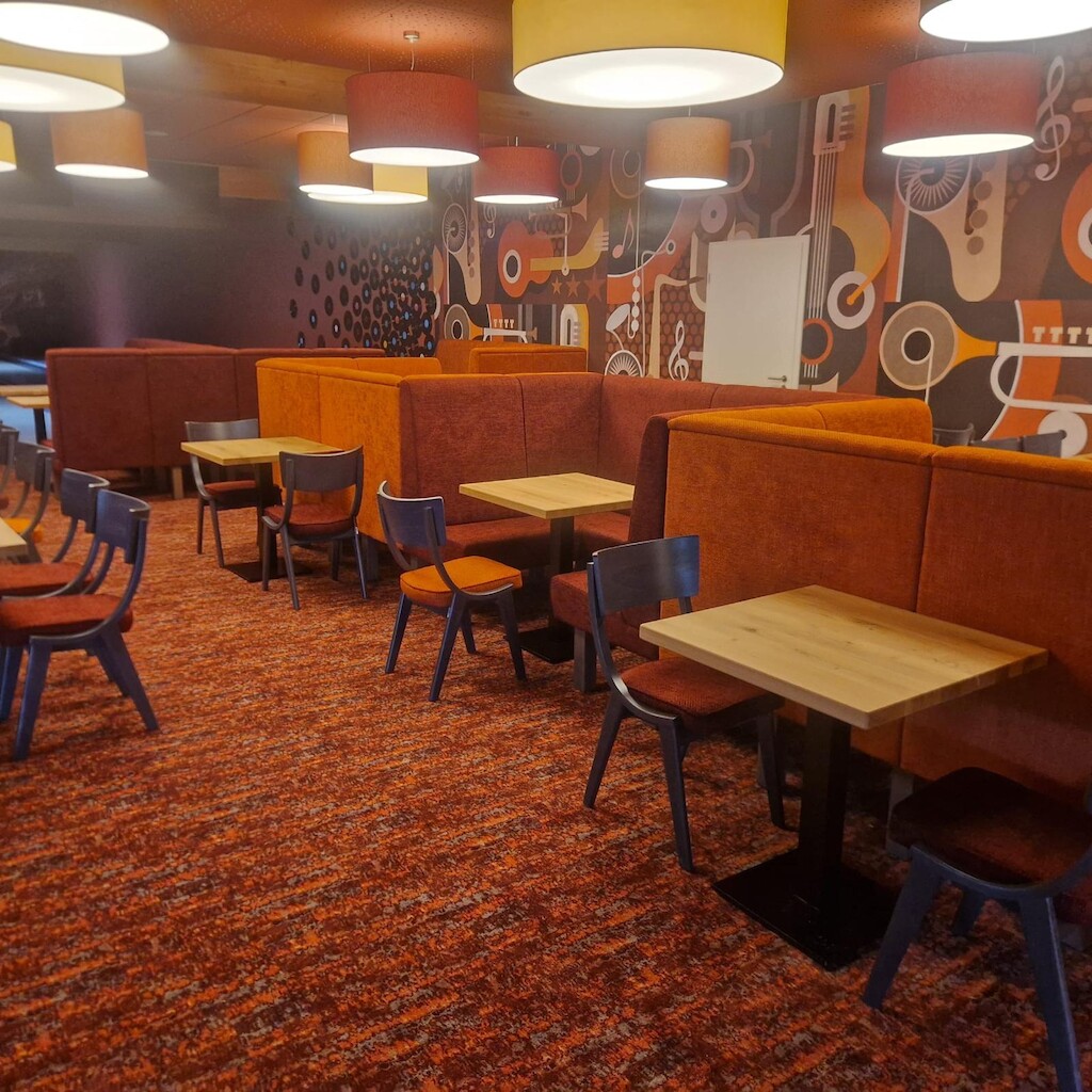 Ein weiteres gelungenes Projekt, das Komfort und Design eindrucksvoll vereint: Im Freizeitcenter Rammenau durften wir den Restaurantbereich mit einem neuen Teppichboden ausstatten. Auf 134 m² kamen Teppichfliesen aus unserer QStep Tiles Collection, Dekor F04-05A, zum Einsatz.